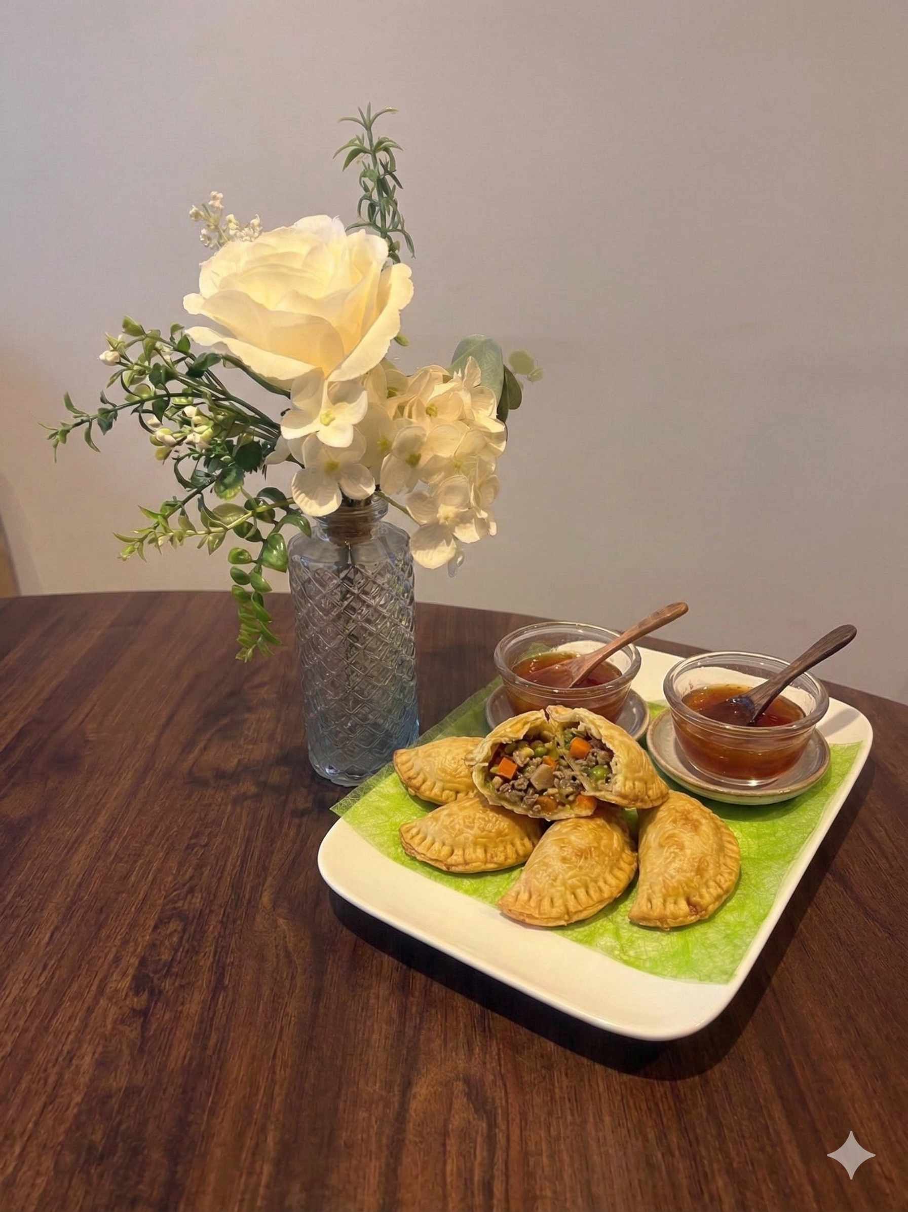 Knapperig deeg omhulsel met rundergehakt en groenten of met kip en groenten ragout